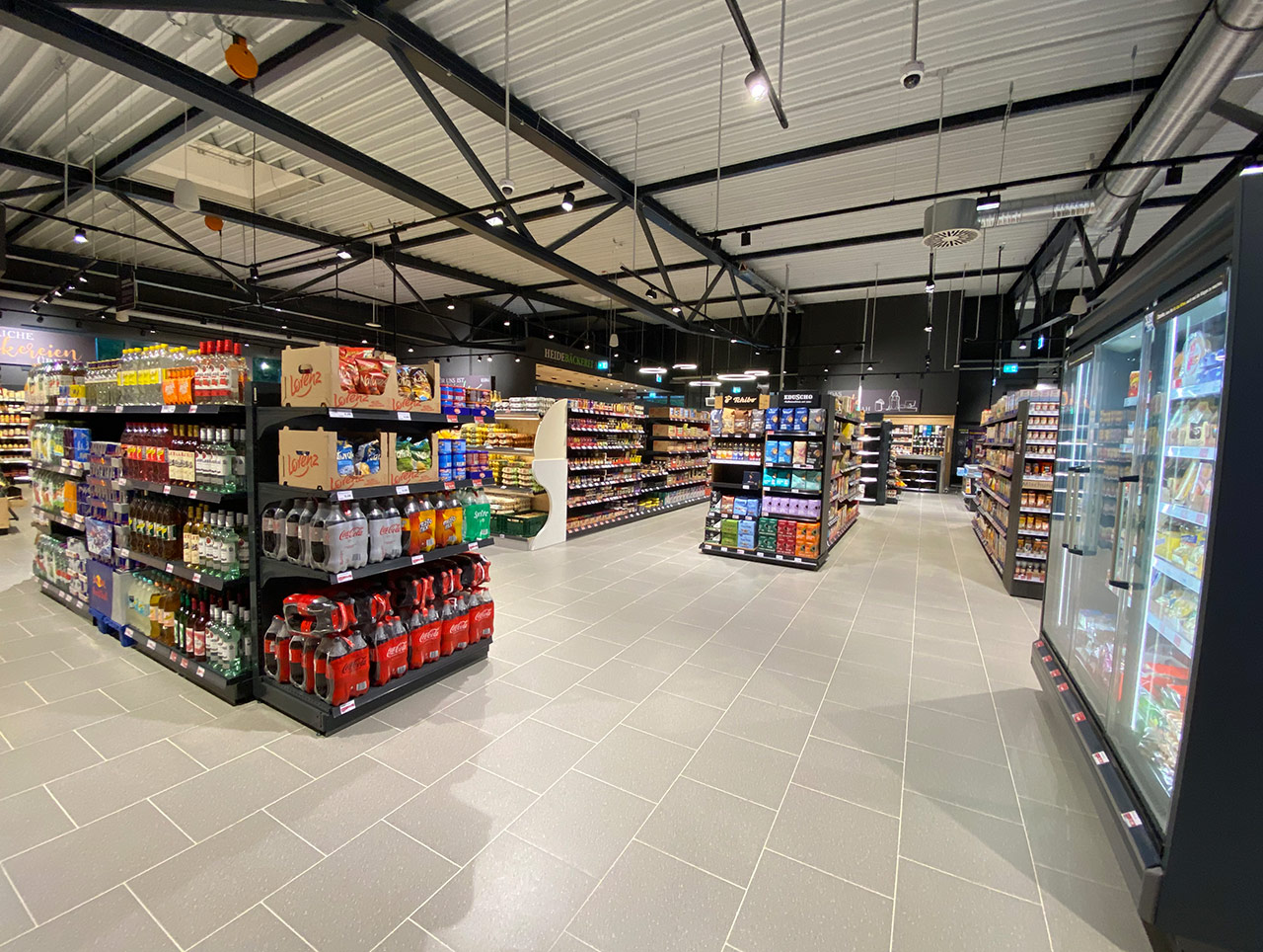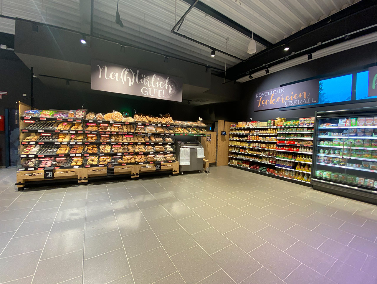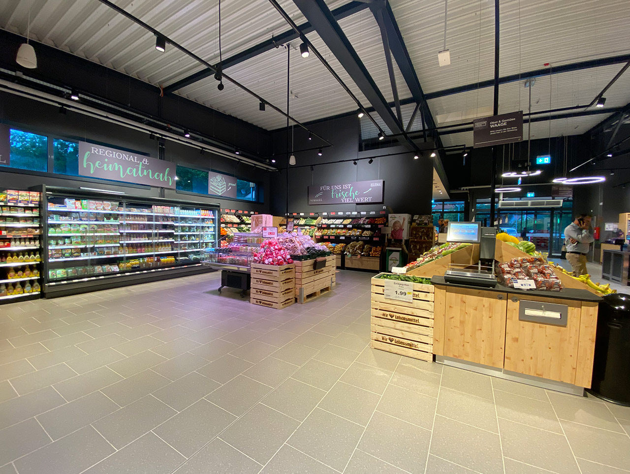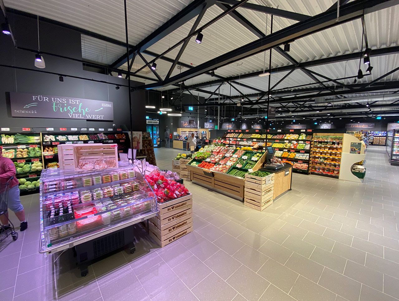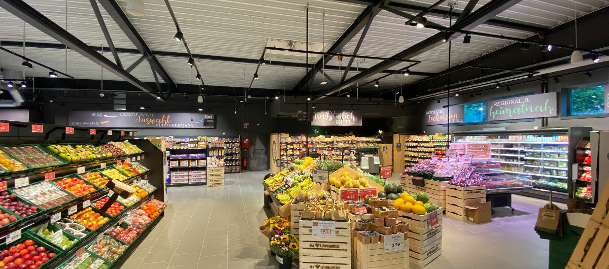 Der Markt ist ebenfalls nachhaltig ausgerichtet. So werden die Kühlmöbel mit dem natürlichen Kältemittel CO2 betrieben. Für eine konstantere Temperaturführung sind sie mit Glastüren verschlossen. Zusätzlich wird der Markt mit der Abwärme der Kühlanlagen und einer Wärmepumpe geheizt und verfügt zur Temperierung über eine Flächenheizung in Form einer sog. Betonkernaktivierung.