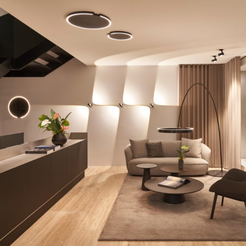 Mit einem multifunktionalen Konzept will der Store die interaktiven Anwendungsmöglichkeiten der verschiedenen Produktserien auf geräumigen Flächen zeigen. Intuitive Steuerungsfunktionen wie „Touchless Control“ oder „Color Tune“ können vor Ort ausprobiert werden. Die Designleuchten werden in wohnlichen Umfeldern inszeniert, um Kund:innen beim Besuch im Shop eine Idee davon zu vermitteln, wie die Leuchten in den eigenen Räumen wirken können.
