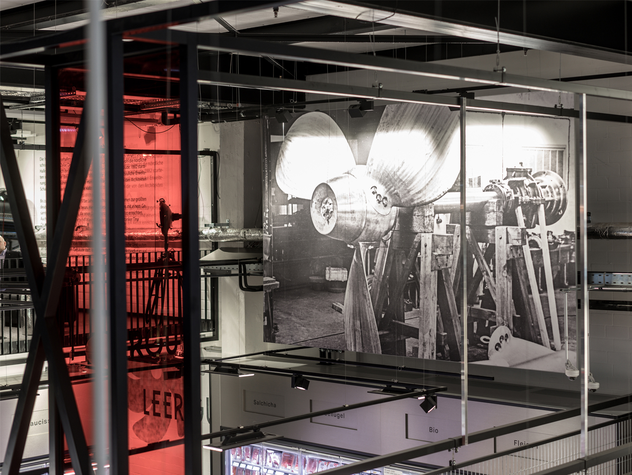 Eingebunden in das Storedesign wurden museale Elemente wie ein 6 x 3 Meter große Schwarzweiß-Bilder. Sie entstammen einem benachbarten Museum. Die großformatig besetzten Beschriftungen im Markt sind vom Stil her an die Jugendstilschriften des ausgehenden 19. Jahrhunderts angelehnt. Ein außergewöhnliches, bezogen auf das Umfeld sehr authentische Detail ist die Original-Schiffschraube unter einer rund 7 x 5 Meter großen Glasplatte direkt im Kundenlauf.