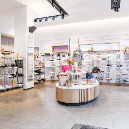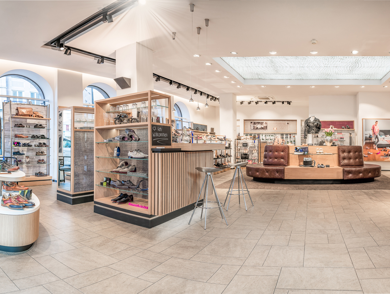 Die Neugestaltung des alteingesessenen Fachgeschäfts betrifft auch das Storedesign, das Bezug zu den historischen Fresken der Fassade nimmt. Stoffbespannte, bedruckte Rückwände verweisen auf die historische Vergangenheit des Hauses und die Zunft der Weber. Unterschiedliche, wechselbare texturale Hintergründe sollen den Raum in Szene setzen und ein modernes, gemütliches Ambiente erschaffen. Das räumliche Zentrum des Schuhhauses bilden eine großzügige Bar und ein im englischen Stil gepolstertes Ledersofa. Sie sollen zum Verweilen einladen und die Aufenthaltsqualität des Gastes steigern.