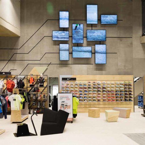 Im zentralen Raum des Ladens wird auf eine Display-Wand gesetzt, mit der sich bewegte Bilder darstellen lassen. „Für die besonders hohe Raumhöhe von 9 Metern war eine ständig wechselnde Dekoration problematisch“, erläutert Marcus Jung, bei Sport Scheck für Bau und Einrichtung zuständiger Projektleiter. „Mit Videos von unseren Events, z.B. den Stadtläufen, auf diesen Bildschirmen emotionalisieren wir die Fläche“, ist Jung überzeugt.