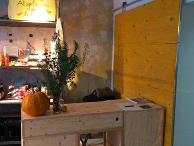 In den Regalen setzen alte, handgefertigte Industriekästen aus Massivholz der in Köln ansässigen Firma „Dinge“ Gemüsewaren in Szene. Zudem stehen dort einzelne Bierflaschen und Bierkästen. Zur Kühlung von Getränken und einigen selbstgemachten Produkten dient ein schmaler Getränkekühlschrank. Schilder aus Pappkarton und kleine Holztafeln geben Informationen zu den Produkten – und machen Kunden darauf aufmerksam, dass es sich um Waren handelt, deren Mindesthaltbarkeitsdatum bereits überschritten wurde. Zahlreiche Details im Raum laden zum Entdecken ein: Gefüllte Einmachgläser im großen Ladenfenster, kleine und große Flechtkörbe sowie Schubladen, die mit verschiedenen Lebensmitteln bunt gefüllt sind. Überall im Geschäft hängen Jutebeutel mit regionalem Bezug.