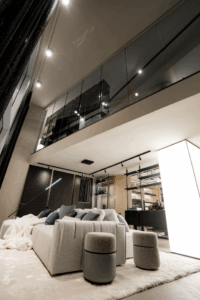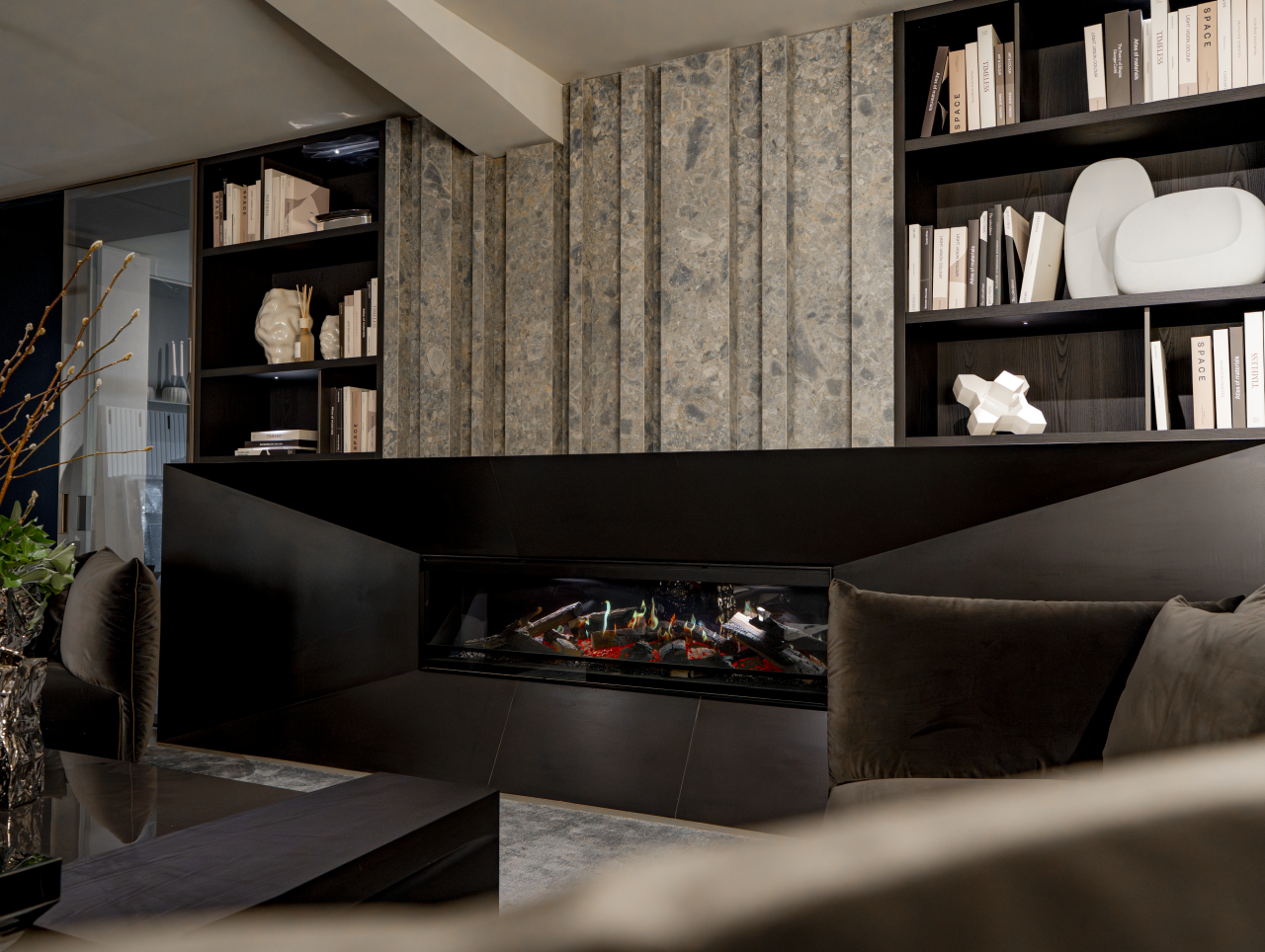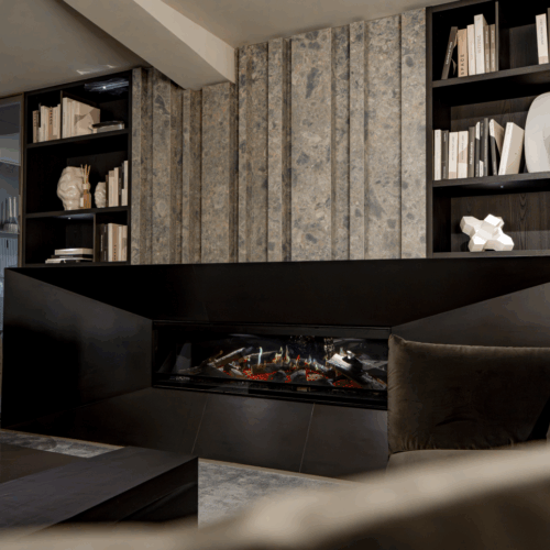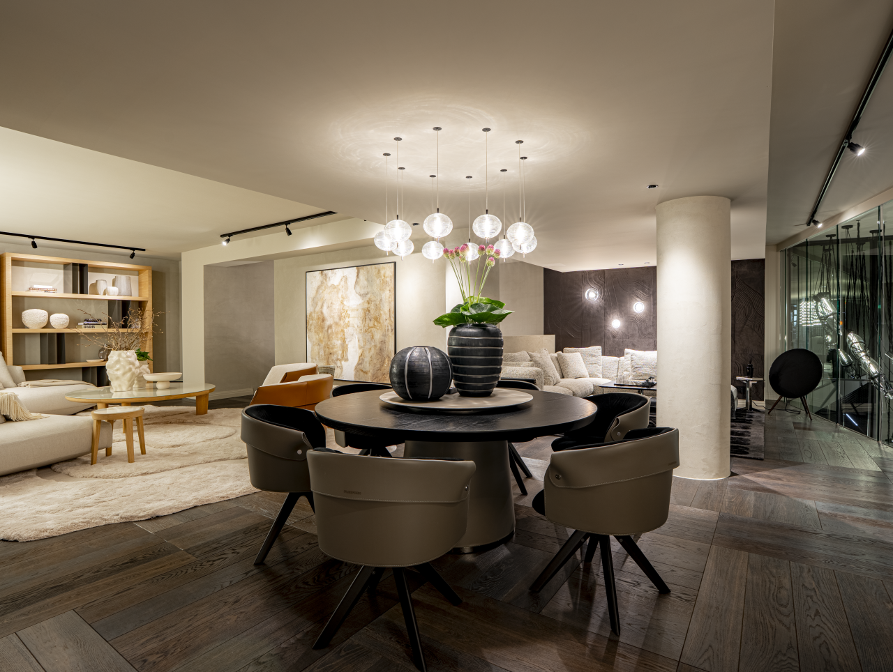Der gesamte Store ist mit Premiummaterialien wie Marmor, Leder und Textil gestaltet und entsprechend des Corporate Designs von Patrick Treutlein in eleganten Dunkeltönen gehalten. Im Obergeschoss führen abgeschlossene Abschnitte, für die extra neue Wände verlegt wurden, die Kundschaft durch verschiedene Wohnbereiche: Wohnzimmer, Schlafzimmer und Badezimmer. Das Untergeschoss als erster Kundenempfangsbereich ist offener gehalten. Im Herzen der Ausstellungsfläche steht eine Küche von Poliform, die auf der Mailänder Möbelmesse 2025 gezeigt wurde. Im hinteren Bereich befindet sich außerdem ein Besprechungsraum, in dem individuelle Raumplanungen mit Kund:innen entwickelt werden können.