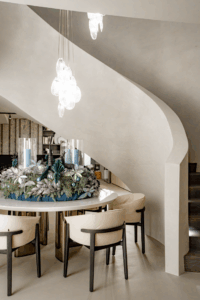Der in rund vier Monaten komplett umgebaute Store verfügt über rd. 500 qm Verkaufsfläche auf zwei Etagen. Bewusst entschied man sich gegen Open Space und für geschlossene Themenbereiche. „Wir wollten Reize setzen und einen Ort schaffen, an dem Kund:innen durch verschiedene Räume gehen und sich inspirieren lassen können. Weniger offene Fläche, mehr Tiefe“, erklärt Binder. Im Zentrum des Stores steht eine historische Wendeltreppe aus den 1950er-Jahren, die mit neu hochgezogenen Wänden eingefasst wurde. Eine markante Lampeninstallation im oberen Schaufensterbereich soll bereits vom Kaiser-Wilhelm-Ring aus Aufmerksamkeit erregen.