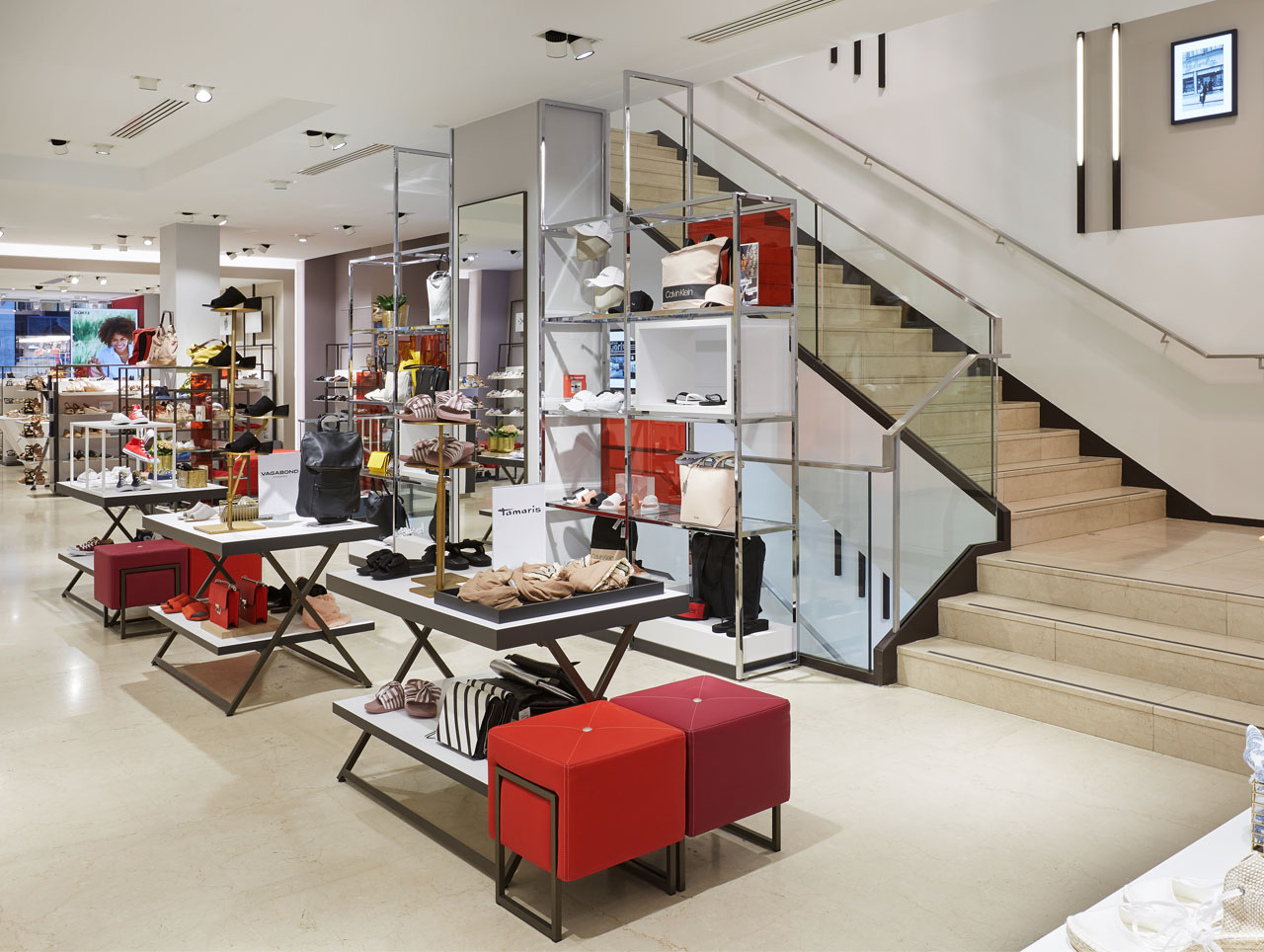 Im Erdgeschoss werden Damen-Kollektionen angeboten, die auf jüngere Kundinnen abzielen. Hier dominieren die Farben Rot, Gold und Pink. Zwei Videowände und eine goldfarbene Wand sorgen für Aufmerksamkeit. Die Ladenbau-Wandabwicklungen sind auf allen Ebenen gleich und bestehen aus hellem, mattem Schichtstoff und einer Einfassung aus Metallrahmen. Um die lange Ladenflucht zu unterbrechen, sind hier und da u-förmige, mit LED hinterleuchtete Bogen- und Wandelemente eingefügt. Themen-Wände mit changierenden Tapeten von Zaha Hadid bringen ladenbauliche Abwechslung. Der Fußbodenbelag besteht neben akzentuierenden Teppichboden-Auflagen aus Botticiono-Classico-Marmor, der auf allen Verkaufsebenen verlegt wurde. Sein neutrales Beige harmoniert mit allen anderen Farbwelten.