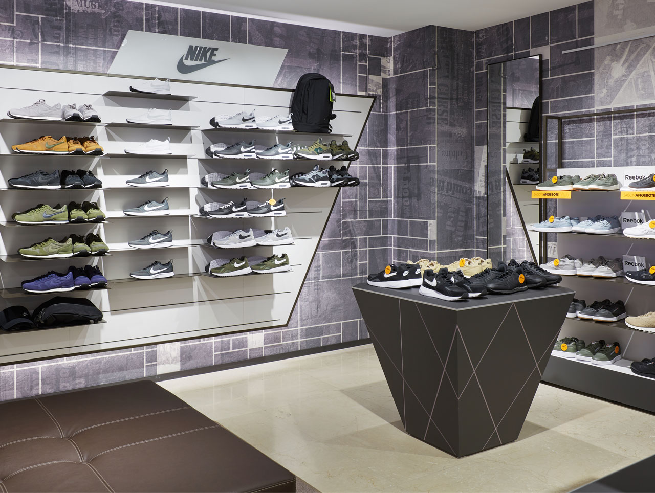 Im Untergeschoss, der sportlichen Young-Fashion-Abteilung, herrschen Oberflächen aus Beton, Metallgitter und Rahmen vor. Schwarz und Grau geben den Ton an. Eine große Sneaker-Wand mit vielen bekannten Namen und ein Adidas Original-Shop-in-Shop dienen als Anziehungspunkte. Der Kinderbereich gibt sich knallig und frisch: helles Orange, Grasgrün und Türkis lassen die Welt der Kleinen erstrahlen, komplettiert durch farbig passende Tische und Sitzgelegenheiten.