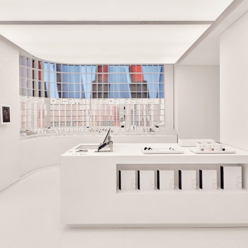 Entworfen wurden die cleanen, an Container erinnernden Räume komplett vom firmeneigenen Architekturbüro. Die neutralen, hellen Farben der Wände, Böden und Decken und die klaren geometrischen Einrichtungselemente sollen den Fokus optisch ganz auf die Kleidungsstücke legen. Die Etage auf Straßenniveau ist mit besonders großen Fensterfronten versehen und wird so in natürliches Licht getaucht. Außen- und Innenraum sollen dadurch optisch verschmelzen, Zierbäume im Raum verstärken den Effekt.