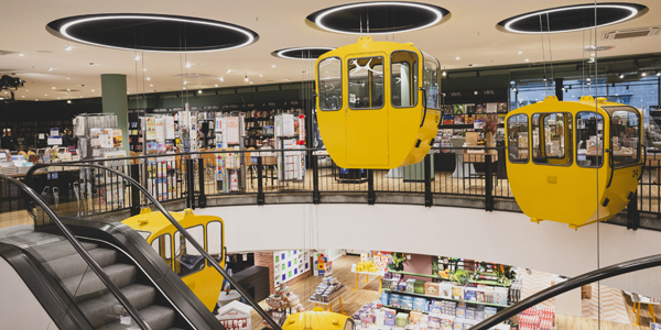 Der Buchhändler Thalia hat seinen Flagship-Stores in Köln 2024 im laufenden Betrieb komplett umgebaut. Mehrere Einrichtungs- und Designelemente referenzieren auf die historische Stadt am Rhein. Besonderes Highlight: Eins-zu-eins getreue Nachbauten der Kölner Seilbahngondeln, die zum Schmökern betreten werden können. Mit dem Café „Buch & Bohne“ betreibt das Geschäft zudem eine eigene Gastronomie mit mehreren Dutzend Sitzplätzen.