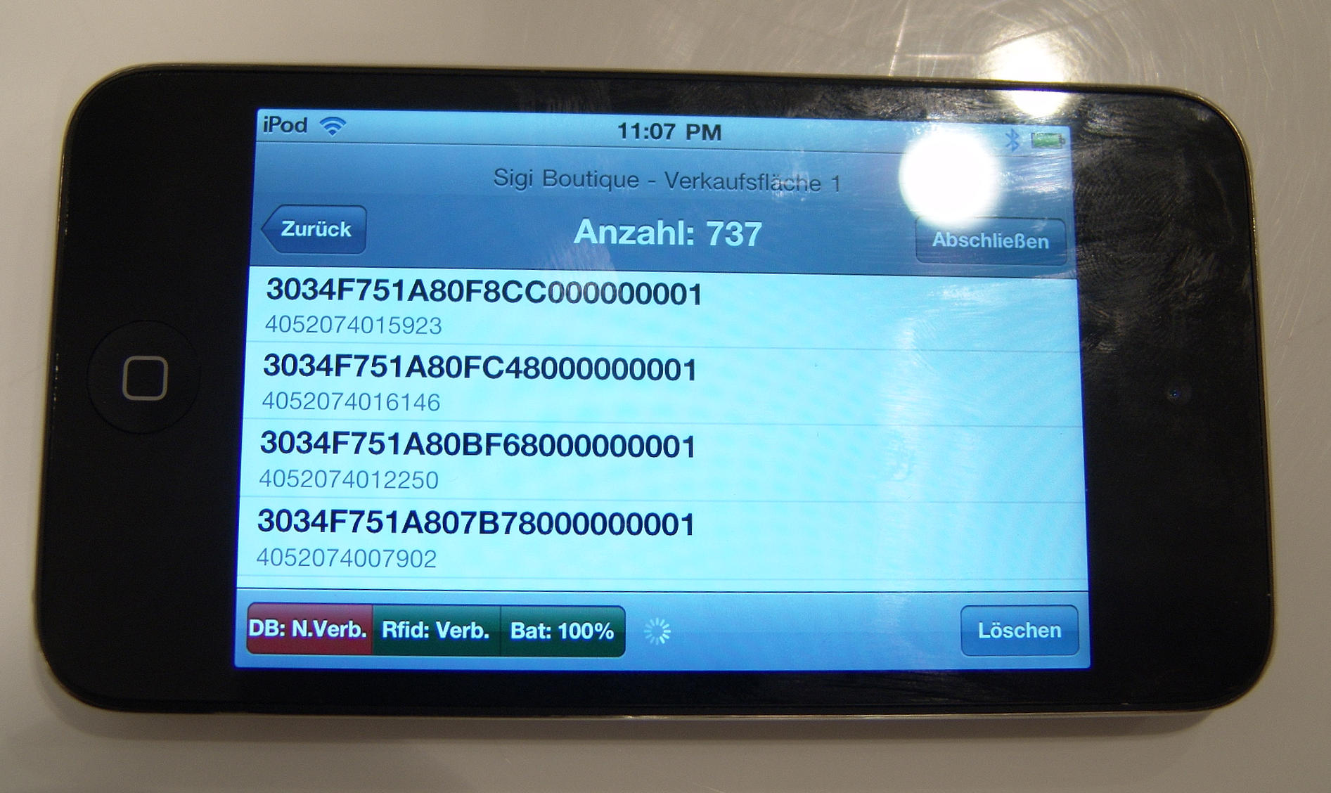 Mit Handheld-Scanner von Nedap wird bei „Sigi“ in kurzer Zeit der Bestand der gesamten Fläche aufgenommen. Die Daten auf Einzelartikelebene werden über eine Bluetooth-Verbindung zum iPod der Mitarbeiterin übertragen. Dort wird die Mitarbeiterin über den Erfassungsfortschritt informiert. „Durch den intensiven Dialog mit den Anwendern und deren wertvolle Anregungen konnten wir die Applikationen besonders benutzerfreundlich gestalten. Davon werden auch weitere Mittelständler profitieren können“, so Eva Brückler von Enso Detego. Ist die Bestandsaufnahme abgeschlossen, werden die Daten über WLAN an den „detego Data Store“ übermittelt. Von dort werden die aufgenommenen Bestandsdaten an das Warenwirtschaftssystem exportiert, das sofort einen Soll-Ist-Vergleich auf EPC-Ebene bereitstellen kann.