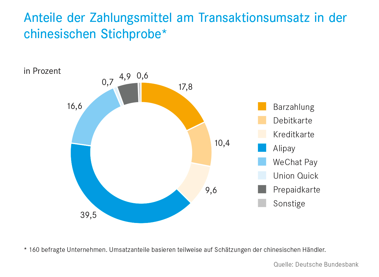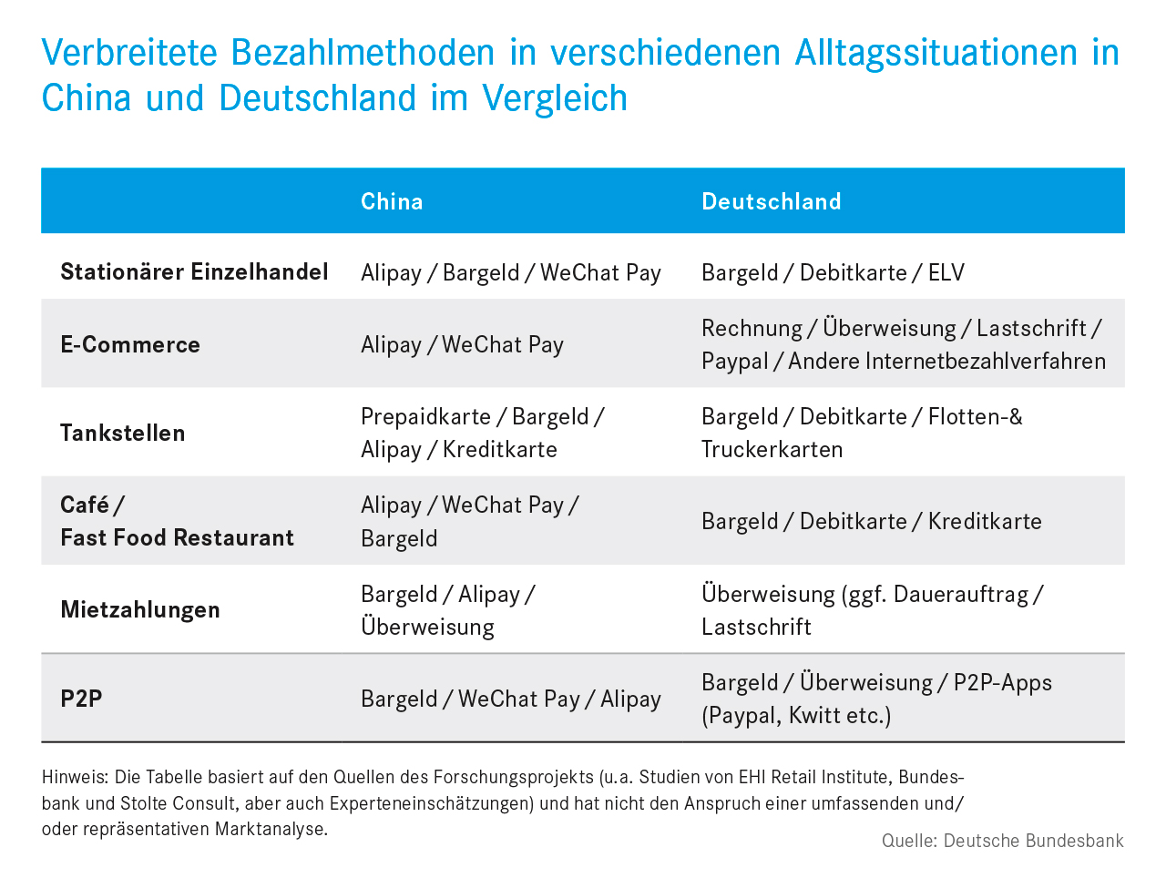 Wie in Deutschland und in den städtischen Metropolen Chinas bezahlt wird, zeigt und analysiert ein gemeinsames Forschungsprojekt von Mitarbeitern der Bundesbank, der Academy of Internet Finance der Zhejiang Universität Hangzhou, des House of Finance der Universität Frankfurt und der Deutschen Gesellschaft für Internationale Zusammenarbeit GIZ. Hierfür wurden in einer kleinen Felderhebung unter Händlern in drei chinesischen Großstädten eigene Daten erhoben sowie auf bestehende Studien zum Beispiel des EHI Retail Institute und die Zahlungsverhaltensstudie der Bundesbank zurückgegriffen.