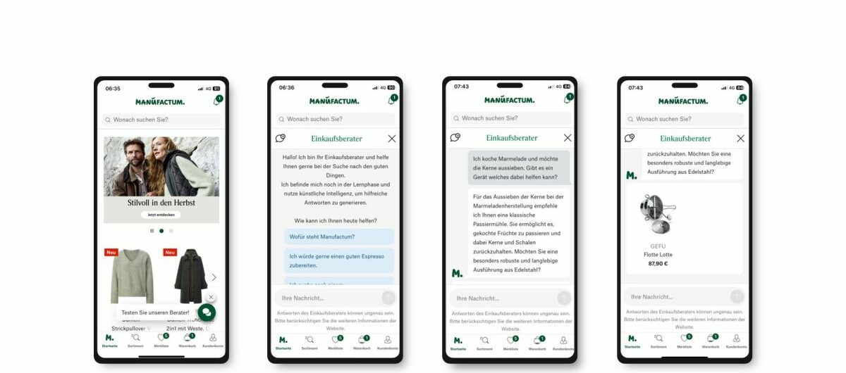 Der Einkaufsberater wurde 2024 zunächst als Prototyp entwickelt und Anfang 2025 gelauncht. Das auf der diesjährigen Connect, der EHI-Veranstaltung für E-Commerce-Entscheider:innen, vorgestellte Tool ermöglicht es, Produkte übernatürliche Fragen zu entdecken, Nachfragen zu stellen und passende Empfehlungen zu erhalten. „Viele unserer Artikel sind erklärungsbedürftig. Der Einkaufsberater eröffnet Kund:innen einen neuen Zugang zu unserem Sortiment und holt sie dort ab, wo sie stehen“, erklärt Alexander Peters, Geschäftsführer von Manufactum. Inzwischen wird das Tool intensiv von der Kundschaft genutzt. Rund 20 Prozent der Gespräche starten dabei über Musterfragen, die durchschnittliche Länge der Anfragen liegt bei nur 40 Zeichen. Erste Rückmeldungen zeigen zudem, dass sich Nutzer:innen lieber mehr statt weniger Produktempfehlungen wünschen.