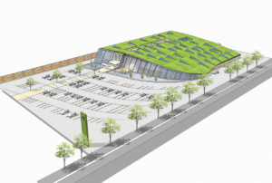 Das begrünte Dach des Modell-Supermarktes macht das Thema Nachhaltigkeit weithin sichtbar. Es trägt zur Klimatisierung des Innenraums bei und hält Regenwasser zurück. Die Dichtigkeit des Gründachs ist gewährleistet durch Systemlösungen auf Basis verschweißter Kunststoffbahnen. Die Dachfenster orientieren sich nach Norden und sorgen für eine gleichmäßige Tageslicht-Beleuchtung ohne direkte Sonneneinstrahlung. Die rückwärtigen Flächen lassen sich für weitere Photo-