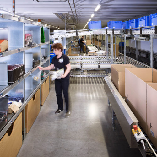 „Bei den Kommissionierprozessen beginnen wir mit der Kommissionierung der C- und D-Artikel aus dem AKL“, wie Walter Stricker erläutert. „Die Fördertechnik transportiert die entsprechenden Behälter zu den Kommissionierbahnhöfen, wo sie auf Kommissionierwagen umgebucht werden, mit denen die Mitarbeiter die Schnelldreher-Artikel der Kategorien A und B hinzupicken und anschließend den Wagen zum Bahnhof zurückfahren. Dort wird über ein Sortierregal von einer artikelreinen Kommissionierung zu einer auftragsbezogenen Kommissionierung umsortiert.“ Der fertige Auftrag liegt nun in einem Kommissionierfach und löst im so genannten „Karton-Start“ den richtig dimensionierten Karton aus. Dieser wird zum Sortierregal transportiert, wo der Putterin per Lichtsignal angezeigt wird, aus welchem Fach die Artikel in den jeweils vordersten Karton gepackt werden müssen. Durch Vielfach-Scanning ist Fehlerfreiheit nahezu vorprogrammiert, denn jeder Artikel wird in den Kommissionierbereichen, beim Entnehmen aus dem Sortierwagen und beim Einlegen in den Karton gescannt, sodass auf eine Endkontrolle verzichtet werden kann.