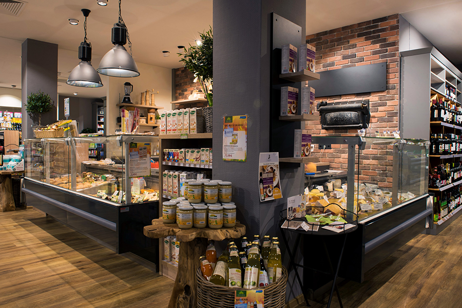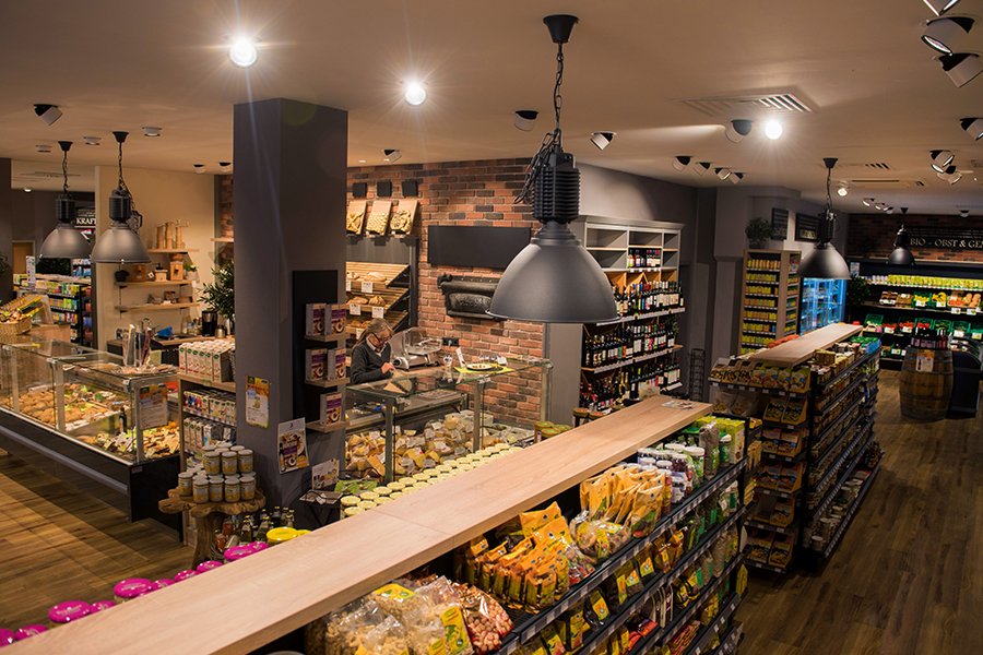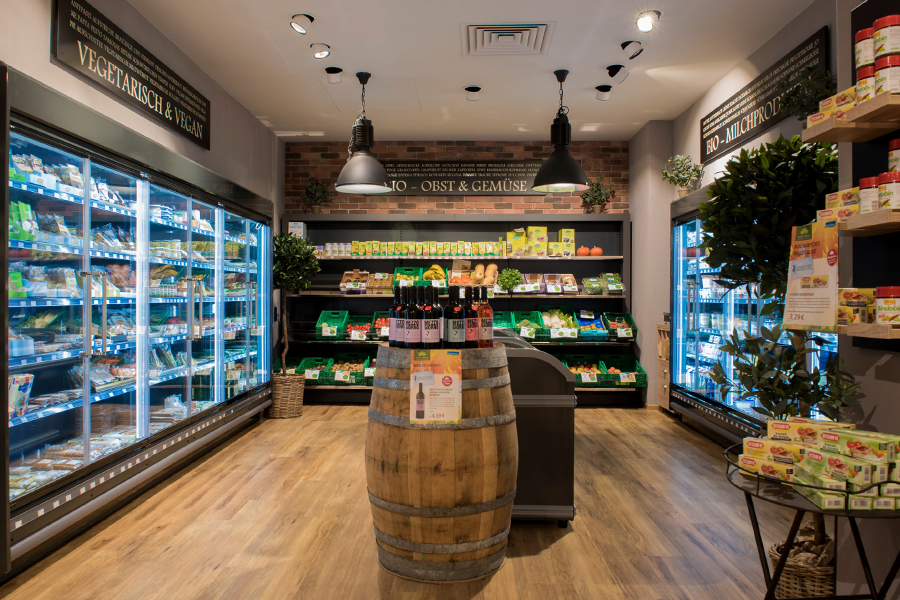 Aufgrund transparenter Abstandshalter benötigen die Möbel der Serie „Albatros“ von der Kühlmöbelwerk Limburg GmbH keinen Türrahmen und bieten Kunden und Mitarbeitern bei geschlossener Regaltür vollständigen Einblick. Der Händler erhofft sich, die Warenentnahme auf wenige Sekunden zu reduzieren und damit Energie einzusparen. Mitarbeiter können beim Passieren der Regale deren Füllstand prüfen. Die Doppelglas-Isolation soll Gänge warm halten. Durch die großen Glaswände ist das Design der Kühlmöbel dem modernisierten Markt angepasst. Im Bereich der Käsekühltheke kommen individuell auf die Platzverhältnisse des Marktes zugeschnittene Auslagetheken mit EC-Ventilatoren und LED-Beleuchtung zum Einsatz. Die Frontscheiben der Theken, die an ein externes Aggregat angeschlossen sind, können nach vorne geöffnet werden. Dies soll Mitarbeitern das Positionieren der Waren erleichtern. Damit der Verkaufsraum in einheitlichem Design erscheint, hat das Kühlmöbelwerk aus Limburg eine Brottheke für das Naturkost-Fachgeschäft gefertigt, die optisch identisch mit der Käsetheke ist. Auf Wunsch des Besitzers wird hier gänzlich auf eine Kühlfunktion verzichtet.