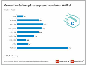 Die Bearbeitungskosten bewegen sich bei den meisten Unternehmen im mittleren einstelligen Eurobereich. Über die Hälfte der Händler (53,3 Prozent) geben die Kosten pro retourniertem Artikel mit bis zu 10 Euro an. Weitere 13,9 Prozent kalkulieren mit bis zu 20 Euro. Bei vielen Händlern erschwert die fehlende Kostentransparenz gezielte Optimierungen. So können 27 Prozent ihre Bearbeitungskosten gar nicht konkret beziffern.