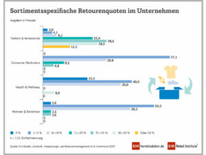 Im Elektronikhandel geben 85,7 Prozent der Händler an, bis zu 10-prozentige Retourenquoten zu haben, während der Rest der Händler höchstens 35 Prozent der bestellten Ware zurückerhält. Möbelhändler beziffern die Rücksendequote zu einem sehr großen Teil (rund 93 Prozent) mit bis zu 10 Prozent, nur sehr vereinzelt liegt die Quote höher. Auch in den Bereichen Spielwaren sowie Bücher & Medien dominieren weiterhin niedrige Rücksendequoten.