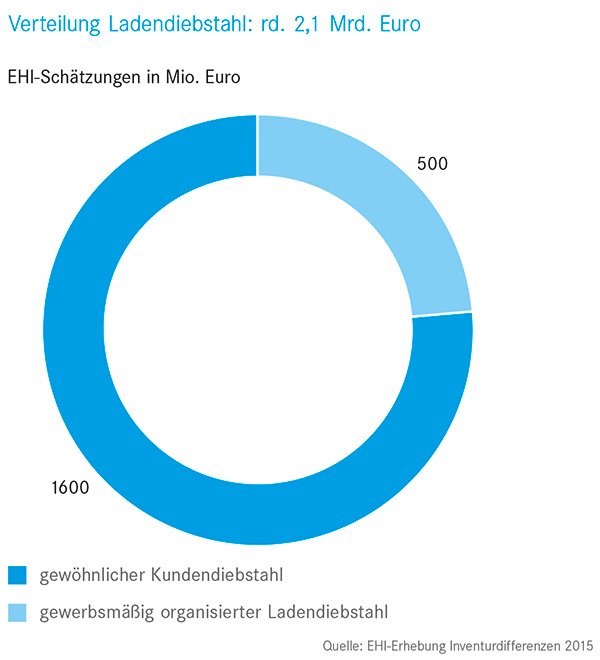 Im gesamten Einzelhandel summieren sich die zu Verkaufspreisen bewerteten Inventurdifferenzen auf 3,9 Mrd. Euro. Nach Einschätzung der Handelsexperten das EHI sind auf Ladendiebstähle durch Kunden rund 2,1 Mrd. Euro zurückzuführen. Den eigenen Mitarbeitern werden fast 900 Mio. Euro angelastet, und sowohl Lieferanten als auch Servicekräften werden etwas mehr als 300 Mio. Euro an Warenverlusten im Jahr zugerechnet. Statistisch gesehen bedient sich jeder Bundesbürger jährlich an Waren im Wert von 26 Euro im Einzelhandel, ohne zu bezahlen. Auf den Lebensmittelhandel projiziert bedeutet dies, dass rund jeder 200. Einkaufswagen unbezahlt die Kasse passiert. Jährlich investiert der Handel rund 1,3 Mrd. Euro in Präventiv- und Sicherungsmaßnahmen, um seine Waren vor Diebstählen zu schützen. Die Gesamtaufwendungen zum Thema Inventur- differenzen und deren Vermeidung betragen damit jährlich rund 5,2 Mrd. Euro.