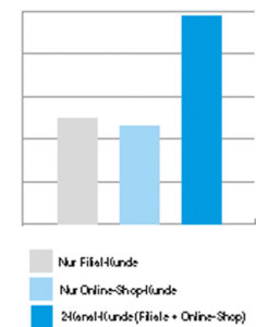 Dabei ist die Antwort ganz schlicht: Zielsetzung einer Multichannel-Strategie ist, die Kunden-Ausschöpfung zu erhöhen, oder in anderen Worten: „the share of wallet“ zu erhöhen. Denn wer sich wirklich mit seinen Kunden und Kundendaten beschäftigt, wird feststellen, dass diejenigen Kunden, die sich virtuos über die Kanäle des Händlers hinweg bewegen und mal im stationären Kanal und mal im Online-Kanal tätig werden, deutlich öfter und einen größeren Warenkorb einkaufen als diejenigen Kunden, die sich nur in einem der parallel betriebenen Kanäle bewegen. Allein die Anzahl dieser sogenannten Mehrkanalkunden, die sich über mehrere Kanäle bewegen, ist als oberste Kennziffer und operationalisierte Zielsetzung einer Multichannel-Strategie zu betrachten. Dieses Kundenverhalten zum einen festzustellen und zu messen und zum anderen als Unternehmen aktiv zu forcieren, setzt eben „nahtlos integrierte Kanäle mit einer kanalübergreifenden Database und kanalübergreifenden Prozessen“ voraus.